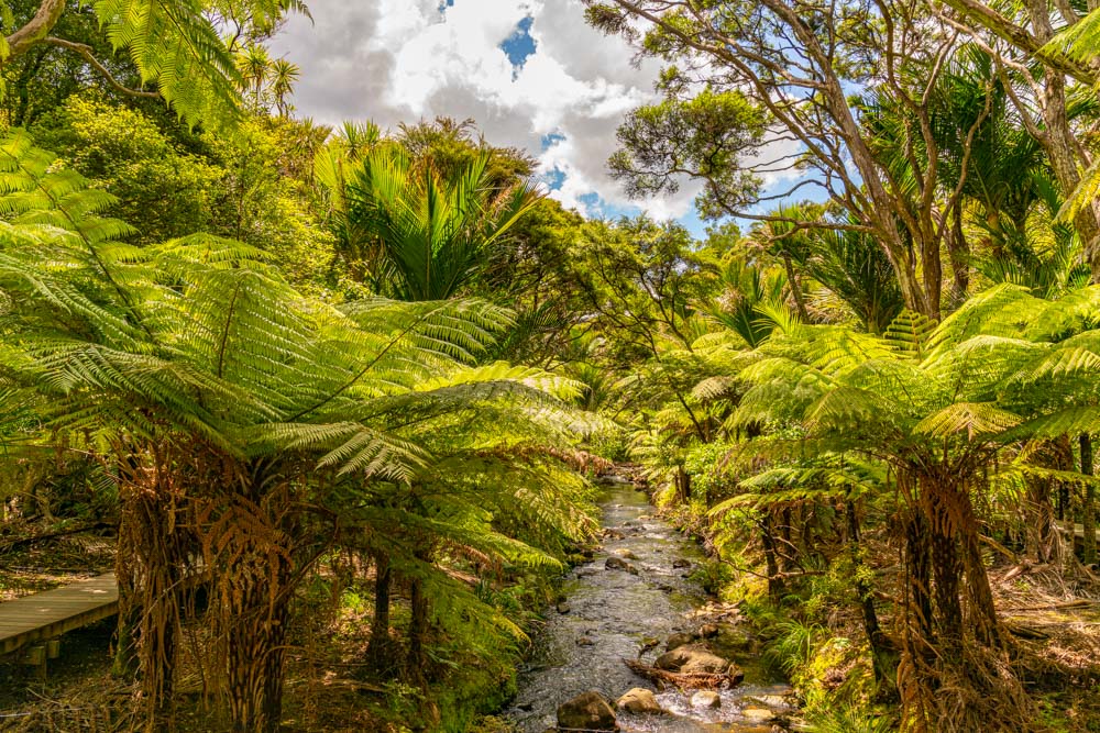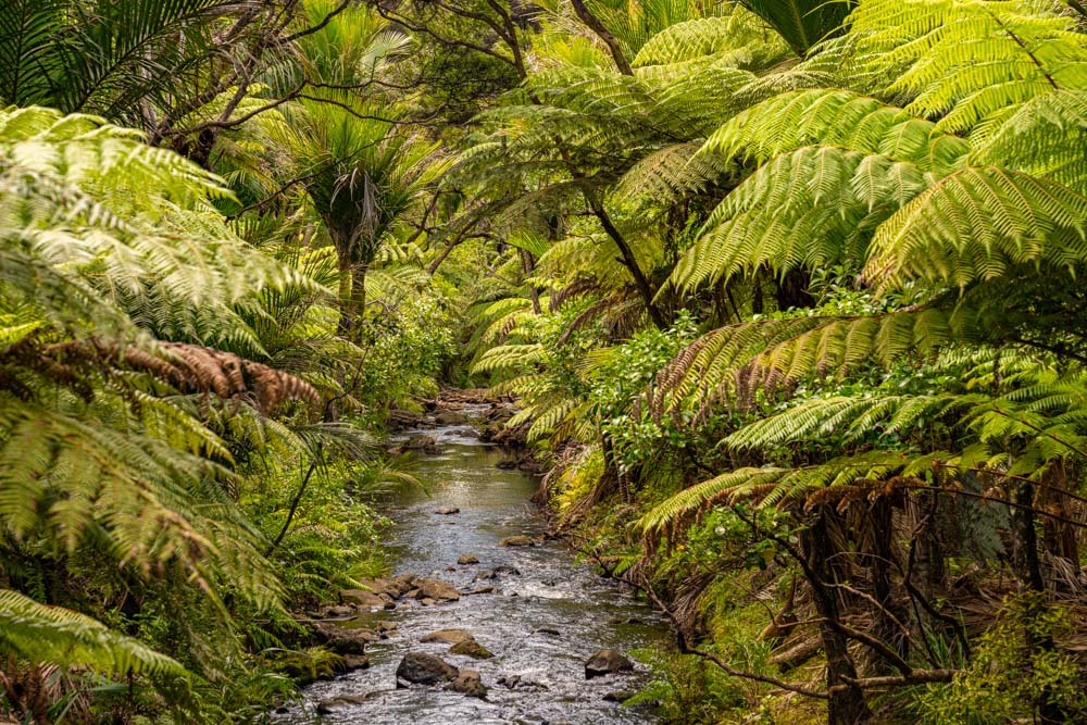 Piha Stream babbles its way off the craters rim.