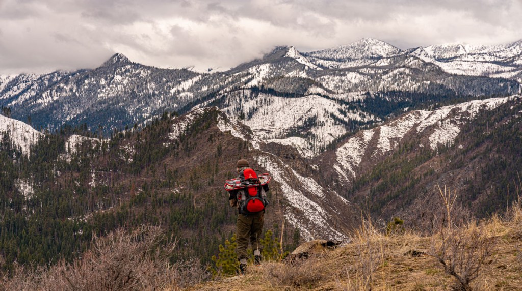Art works his way around the side of the mountain go get a view of the Lick Creek Range. Notice the snowshoes are still on his pack as we near the top, that is a good thing!