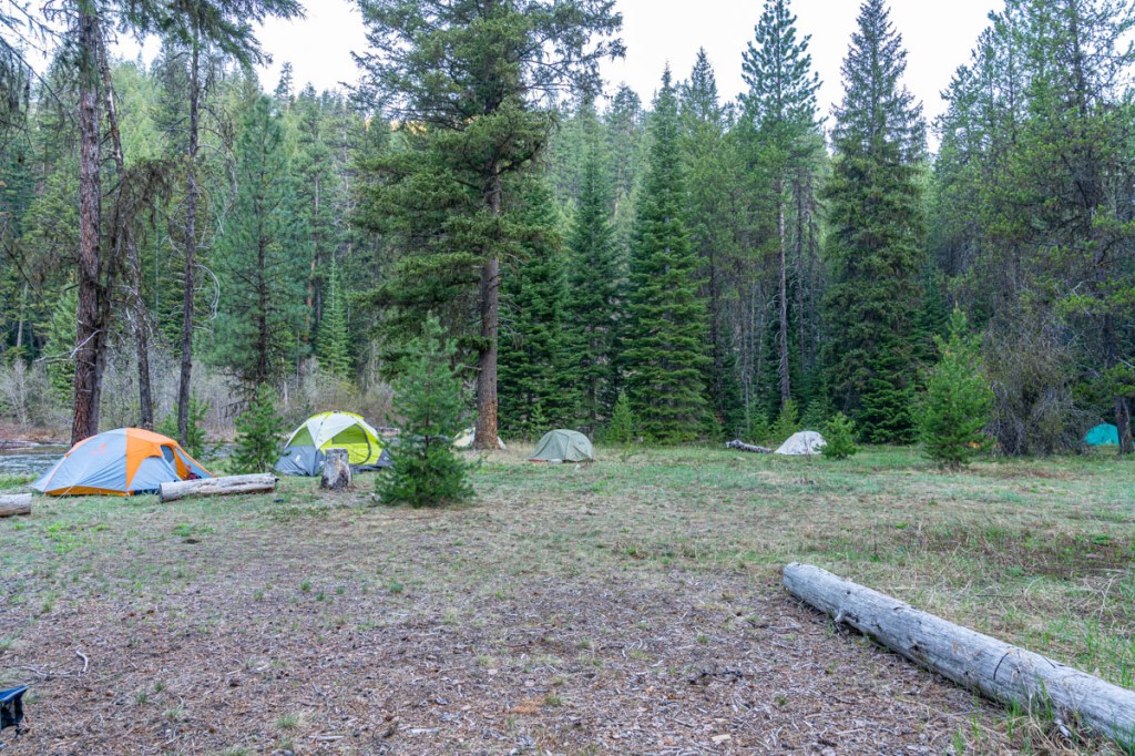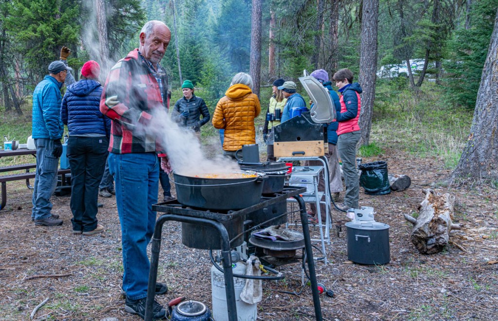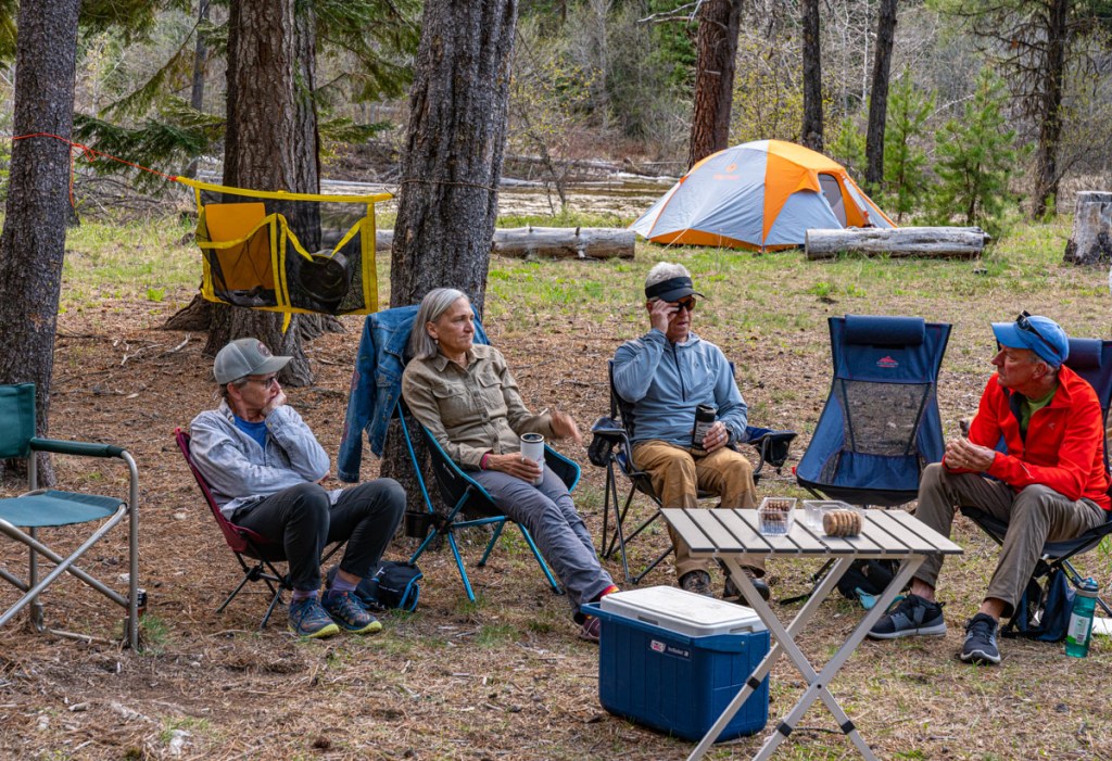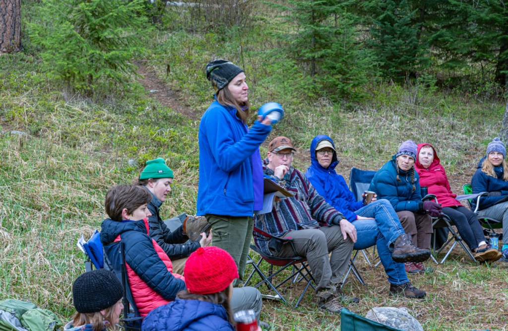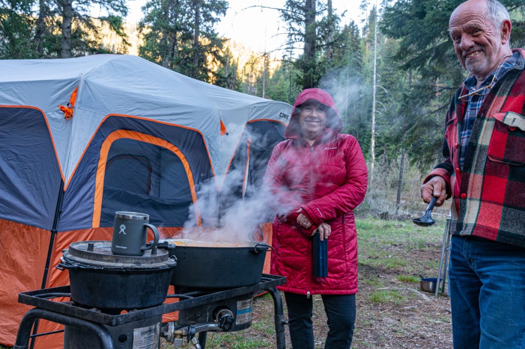The next morning, welcome to the Idaho Mountains in May! Puffy coats and coffee!