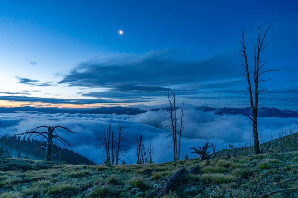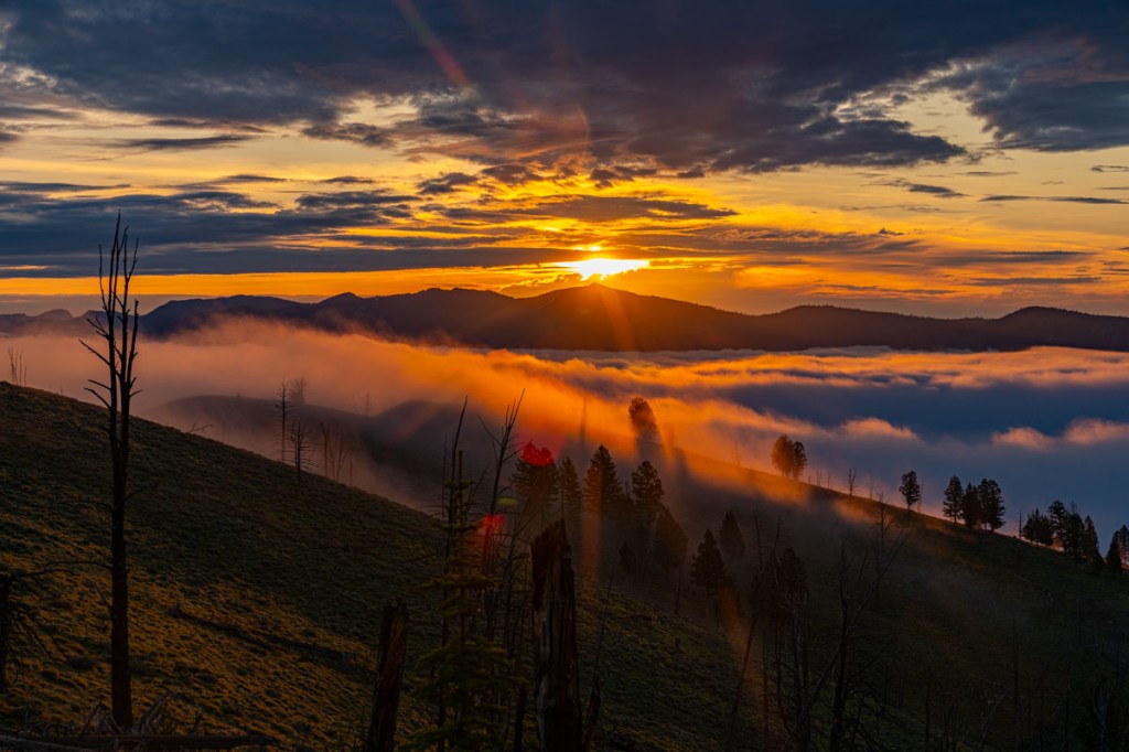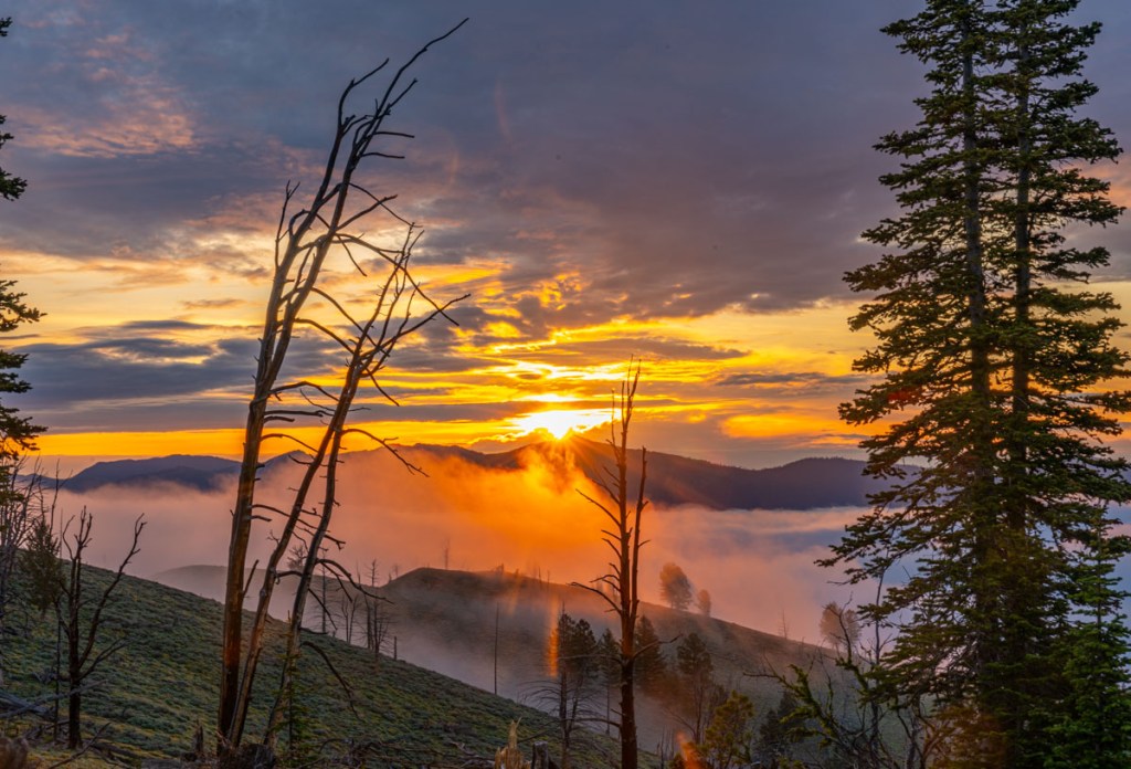 The moment of sunrise over Middle Fork Peak Lookout.