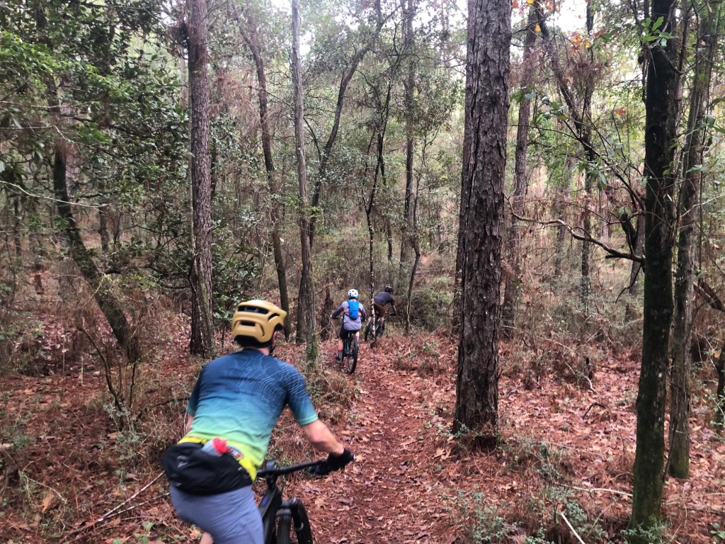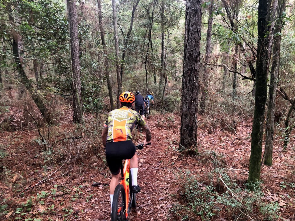 After finding and introducing myself to Anthony who appears to be the ring leader in these parts, I headed out on the trail system noodling along by myself. It wasn’t long before this group of doggs came rolling by. I decided to lift my game and tag on the back. When you are new to an area, you are looking to make some friends. Turns out that these guys are all from Mobile and over just for today’s event. In the back was Jason who is one of the mechanics from Ride More. Jason had worked me over on the road ride yesterday but was super gracious about it. Riding with a bike mechanic named Jason….. tell me if you have heard that one before?