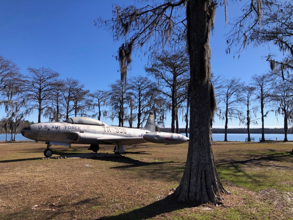 After a goodly amount of time, we arrived at Lake Jackson and stopped to take it in. Turns out that Lake Jackson is in Alabama and that it is the largest natural lake in the state. This old fighter jet reminded me of another plane beside a lake in Idaho. Check it out here and here.