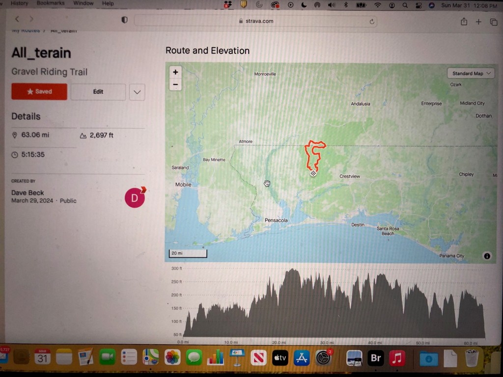 I’m back in Pepsi cola and went out for my weekend gravel ride. Since while riding, I was mostly having my ass handed to me, I did not take many photos. Therefore, I though I would show you our route on this day and is relativeness to all things Northwest Florida…. FYI, our ride time was way faster than the listed 5:15. As you can see, we did roll into Southern Alabama just a touch. Although it was a sure fired butt kicking, the route was amazing and I can tell you that the stretch into Southern Alabama was outstanding! Amazing views and hard packed rolling red dirt roads.