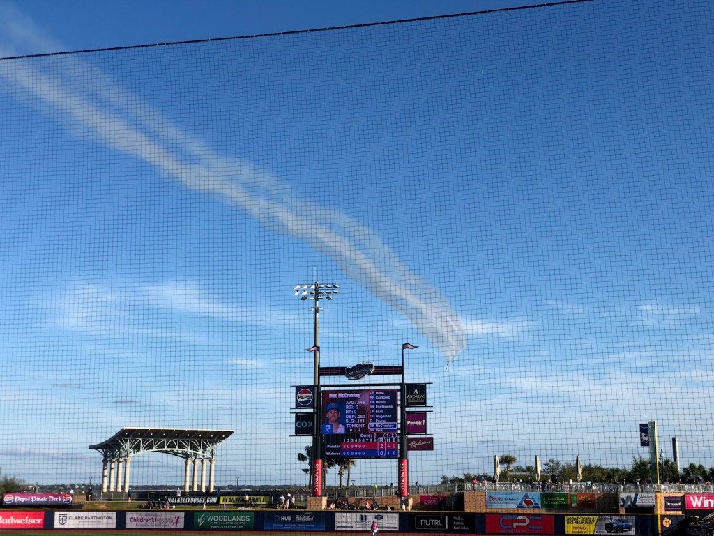 About half way through the game be got a flyover from the Blue Angels. For those of you who don’t know, Pensacola has a Naval Base and it is home for the Blue Angels. Turns out they had just finished an airshow in Orlando and were returning home.