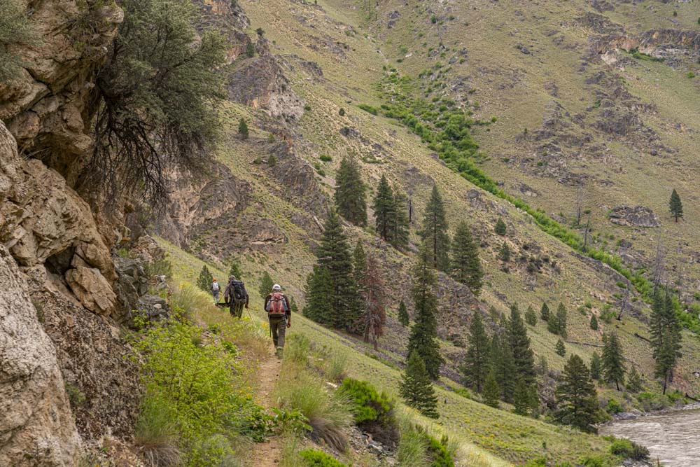 Art makes the climb up and over the ridge at Woolard Creek. You can just make out the trail on the hillside in front of us as well as Tom and Carl standing at the top.