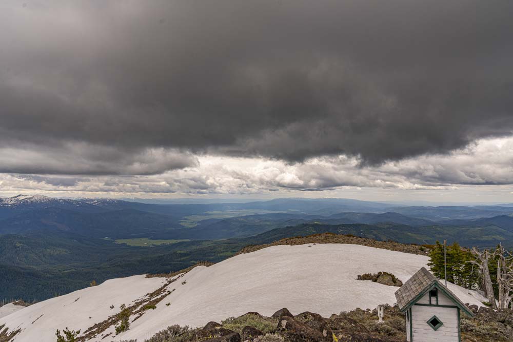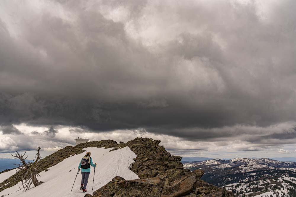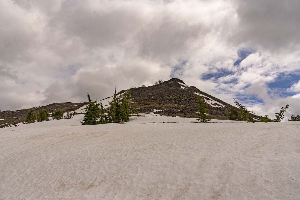 Finally after several hours of climbing, our objective peeks over the ridge. A careful eye can pick out the summit lookout mid-image.