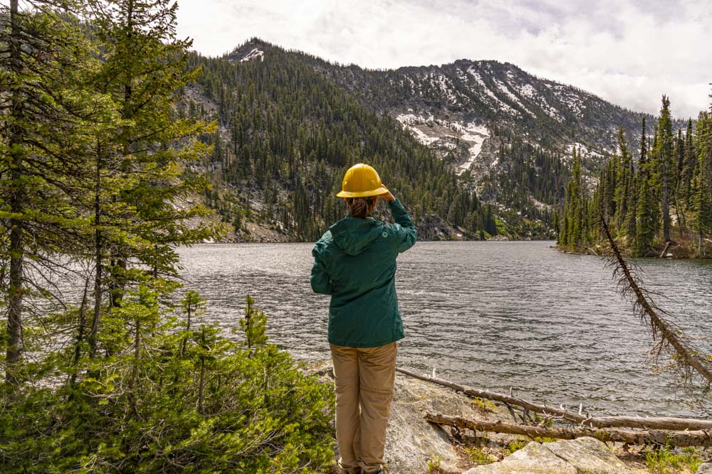 At the lake, Kirsten takes in the view of Square Top Peak.