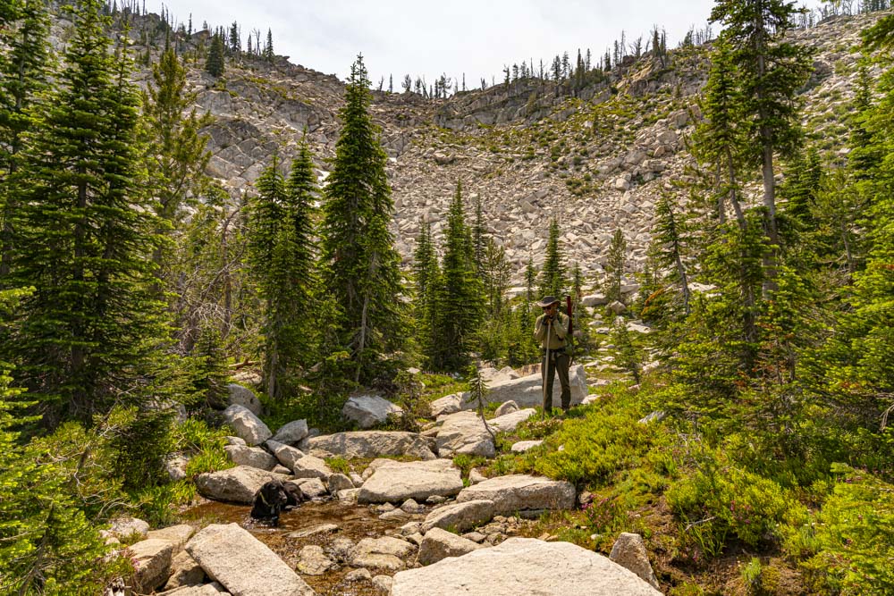 Dan takes a moment to soak it in while Sade enjoyed the recent snowmelt. You can just see through the trees a large bank of mid July snow. We worked our way to camp and settled in for the evening, Dan, Sade, myself and about a billion bugs!