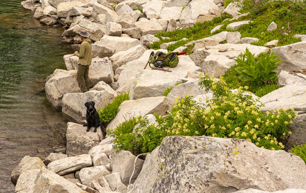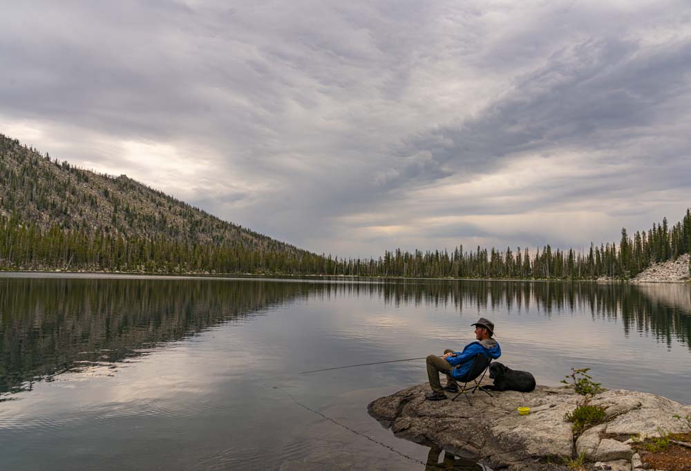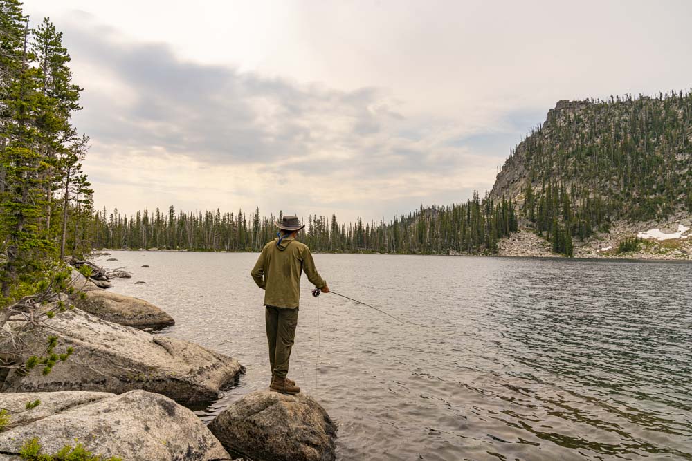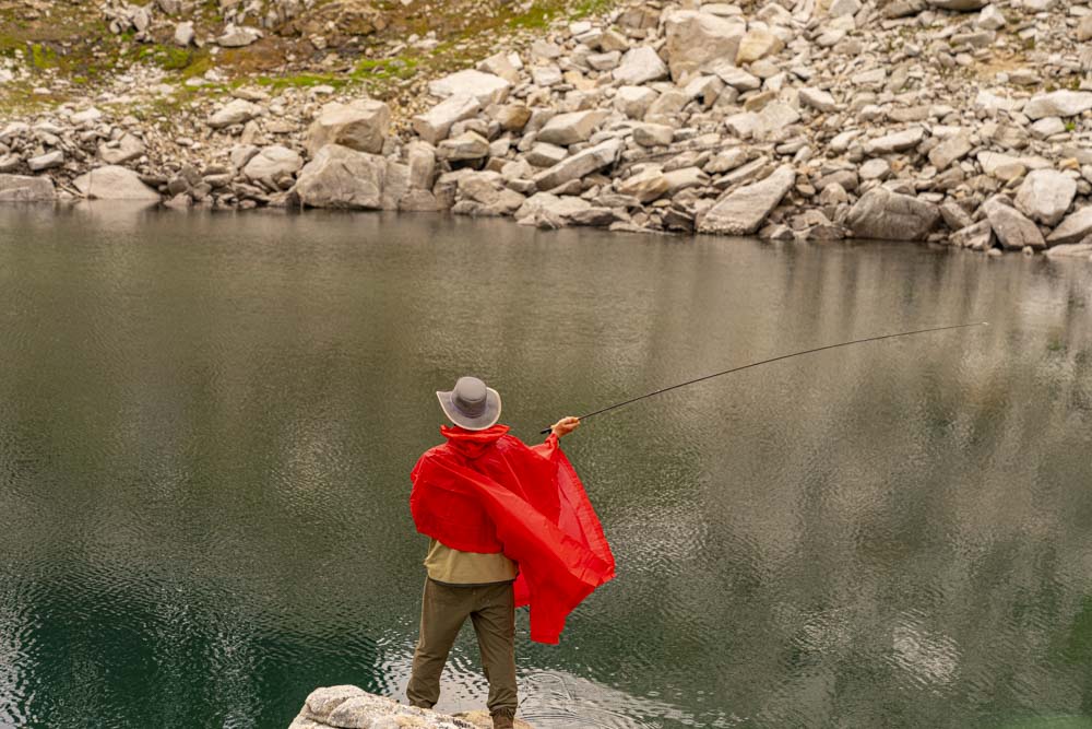 Well, as promised, the moisture in the air delivers a little rain. Dan throws on the rain gear and goes back to fishing…… looking like some sort of fly fishing super hero!