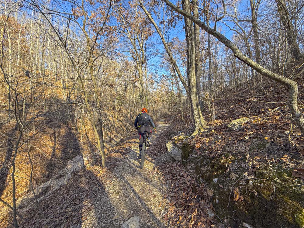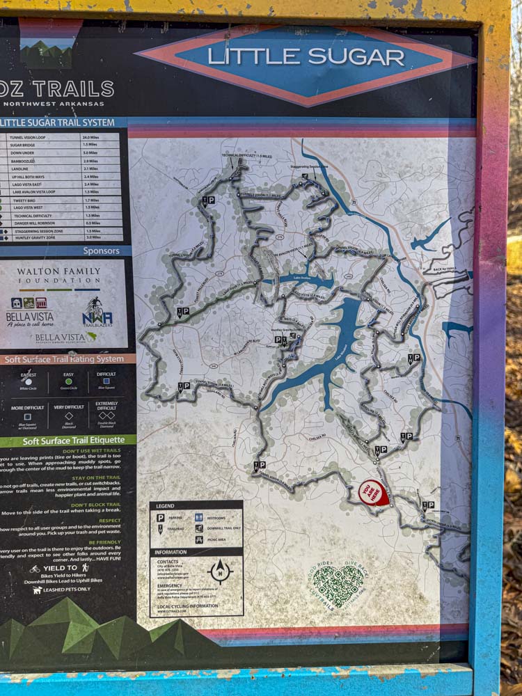 For today’s ride we head north to the village of Bella Vista and the Little Sugar Trail System. This may not look like much on this map but there are about 50 miles of trail here and across the road and to the east is another 50 miles or so.
