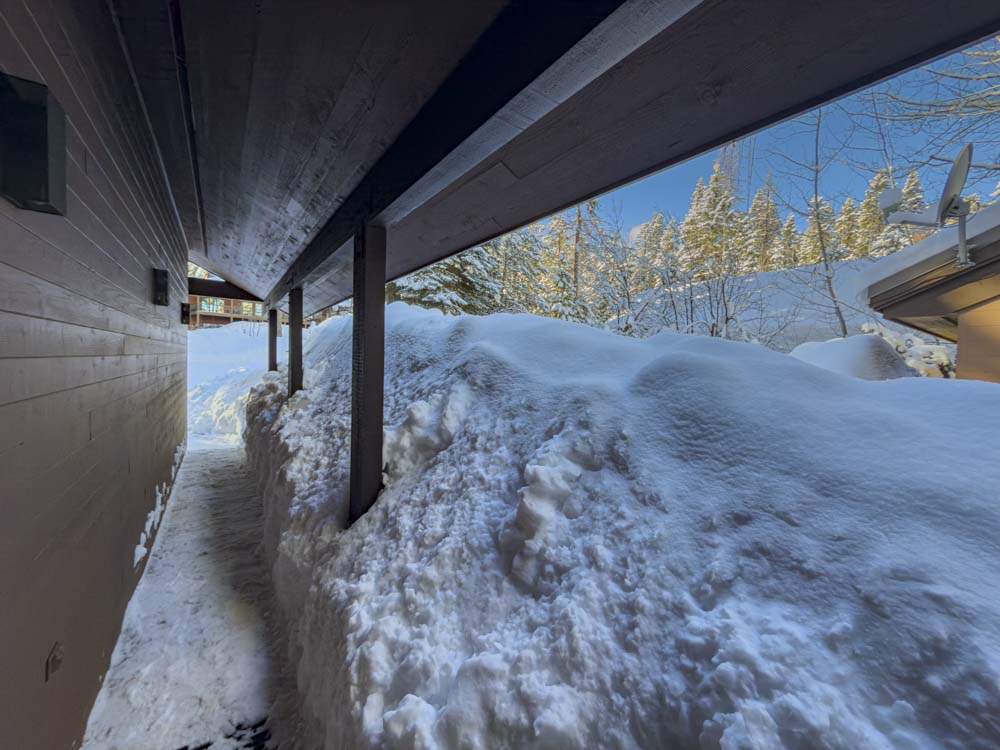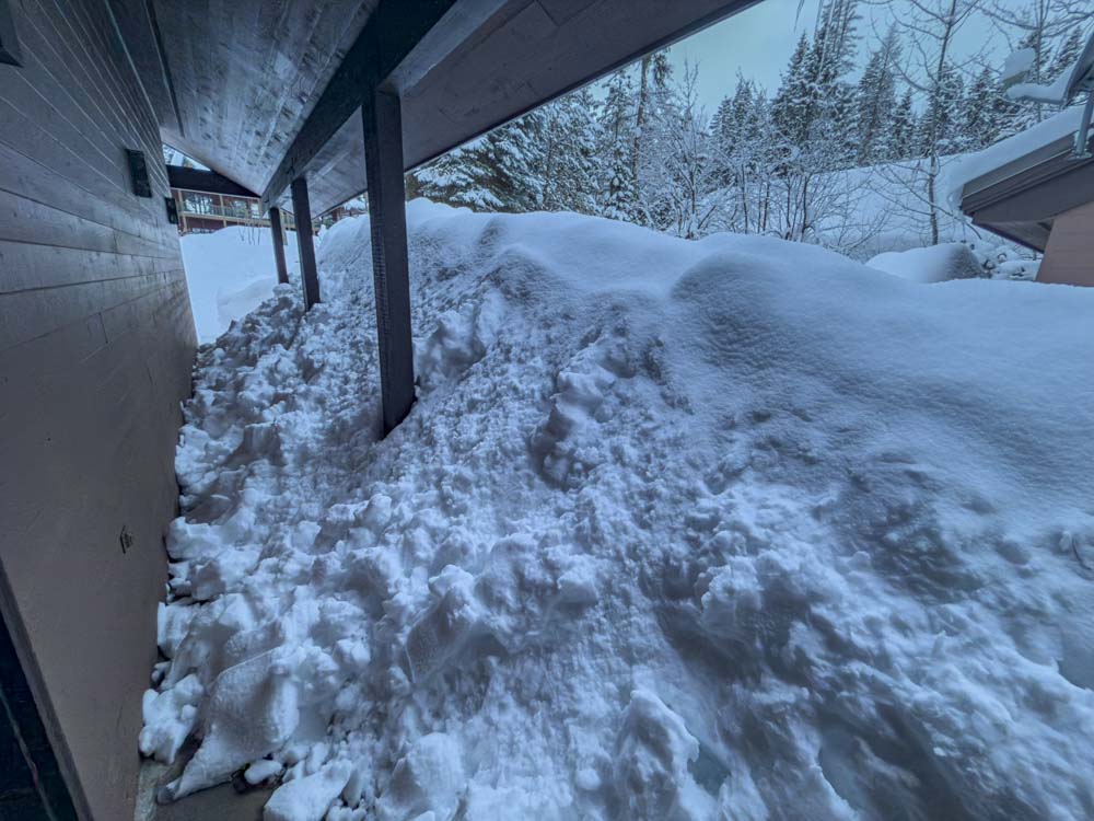This is more or less after. I have been dragging snow off the roof then throwing it off the deck, take a break then repeat. Another couple more days of this then I head back to Pepsi Cola with sore shoulders. It looks easy to pull snow off the roof but it is quite crusty and stubborn.