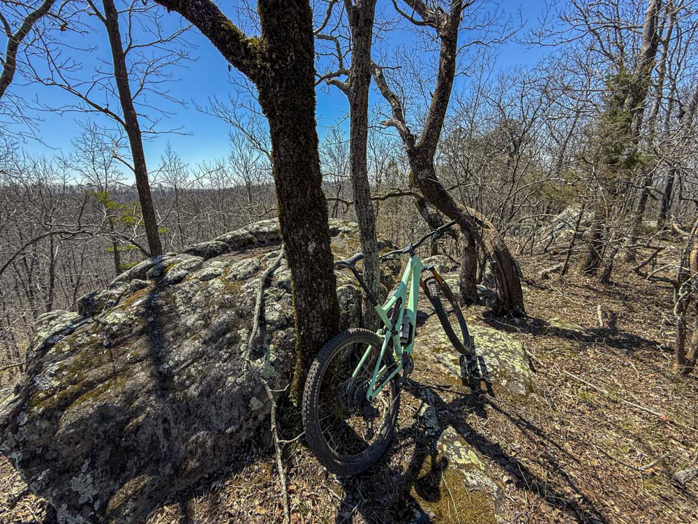 Eventually, I made to what I imagine was the Park’s High Point, Speianchi and I took a break and made a toast to John. After the ride I checked List of John and sure enough, that is Double Oak Mountain. Not much of a view though. Just for perspective, the top of this “peak” is 1510 feet while I am camped at about 700. My total elevation for the day was around 2800 feet of climb in 21 miles.