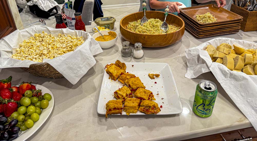 The women-folk make up a bunch of other fixins and you have a dinner! Any time you serve popcorn with dinner, you know it is a special occasion!