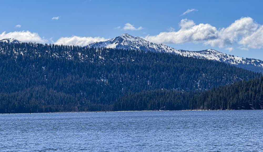 The north side of the lake holds the snow the longest yet the road crew has punched through.