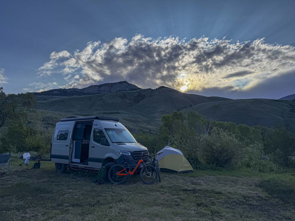 We park the bikes, throw on a lock and put some sage brush subterfuge on top of the fishing lure orange Trek.