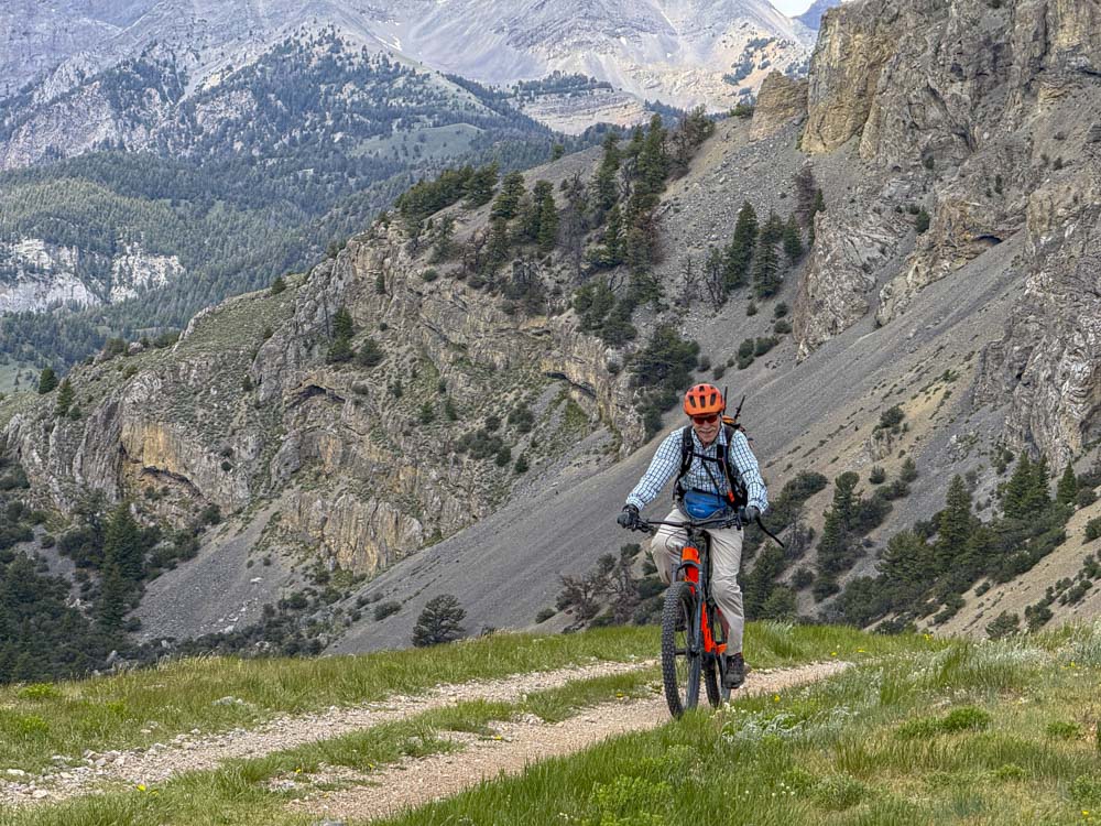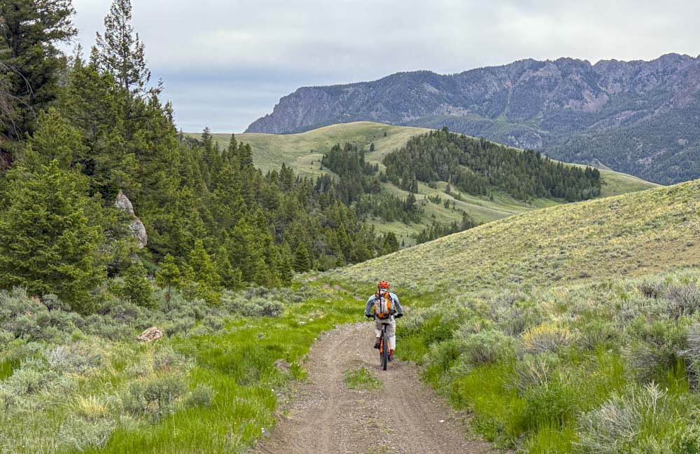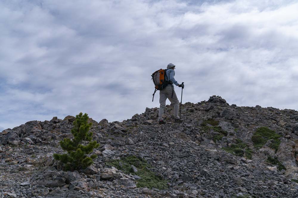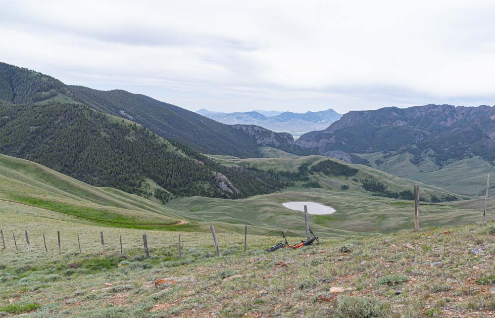 Brian makes his way up to the bike parking spot ahead near the trees. Our climb starts in those trees and goes straight up that ridge….. That ridge looks like a cake walk but I can assure you it was steep. A careful eye can pick out the rock summit just above the end of the grassy ridge.