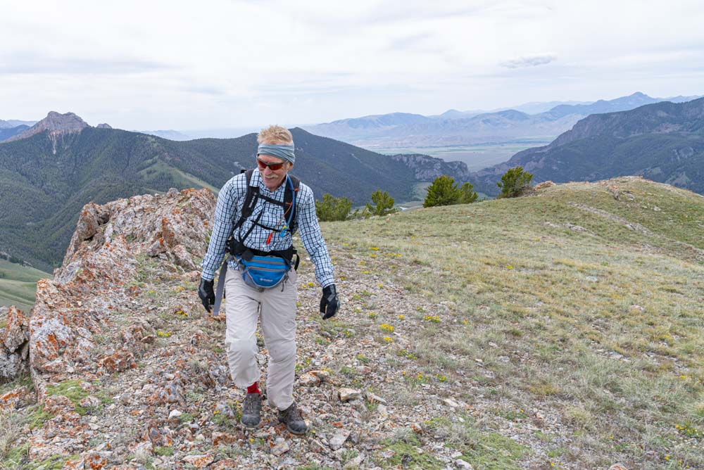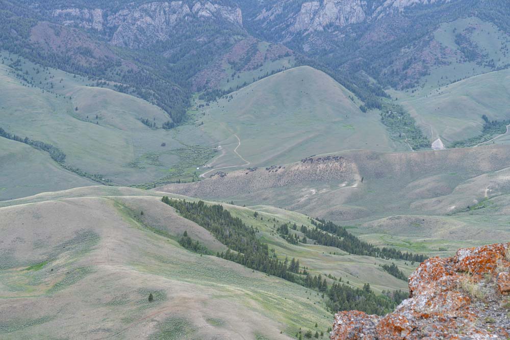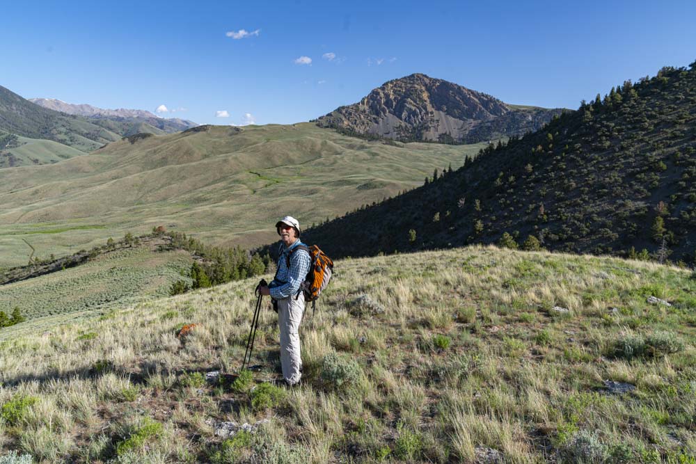 Now a shot looking down the grassy ridge with the “trail” in the valley. Our camp is in the small drainage mid image right side.