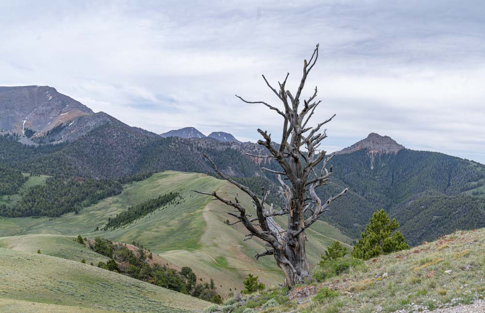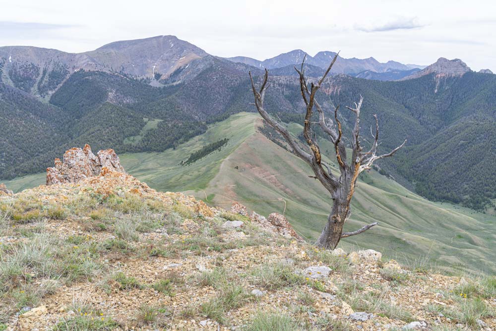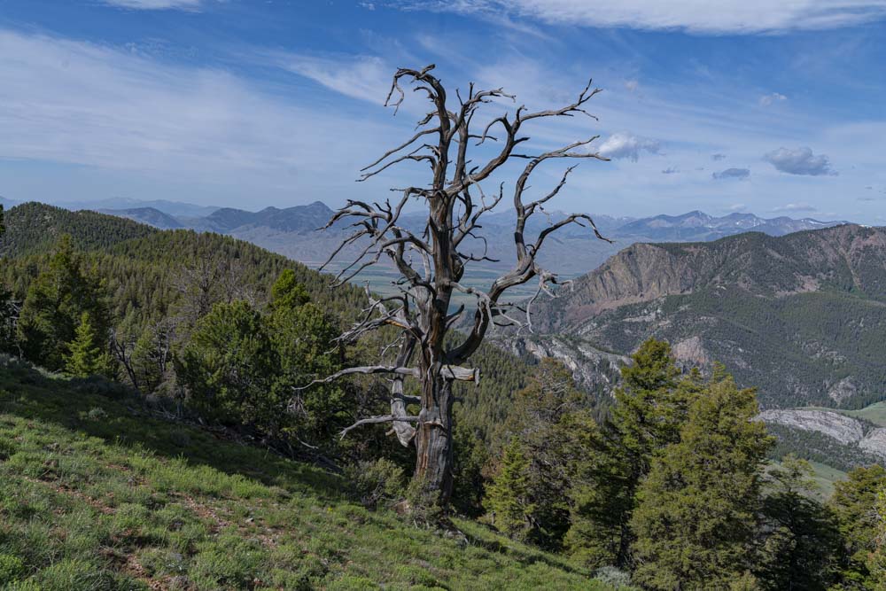 Another snag. Below you can just make out the road to the saddle where we parked our bikes. Also just right of the snag is Mayhem 1 and to the far left is Sunset Peak.