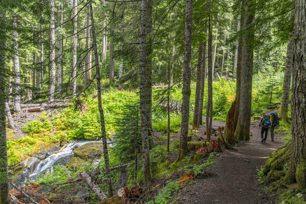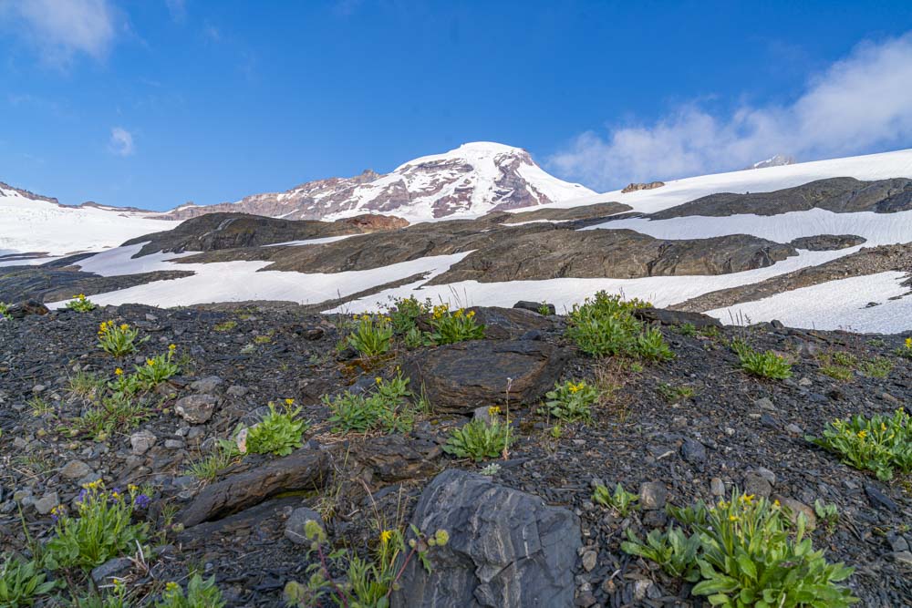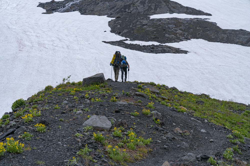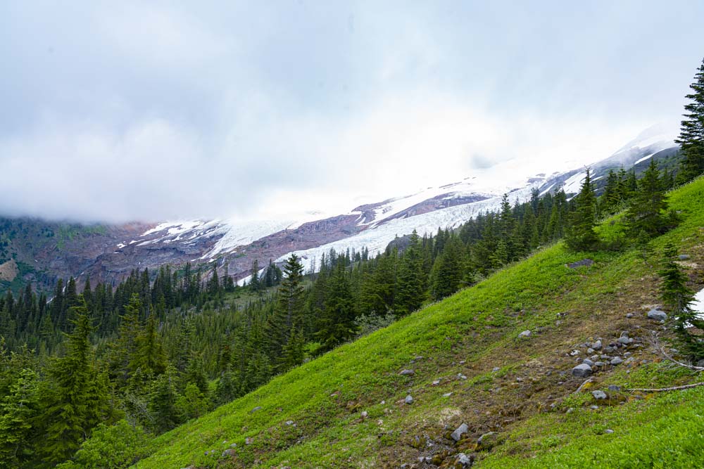 After hiking a goodly amount of time we pop out of the trees and get our first look at the glacier. The remnants of yesterday’s storm are still built up higher on the mountain.