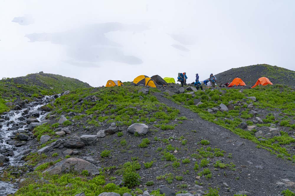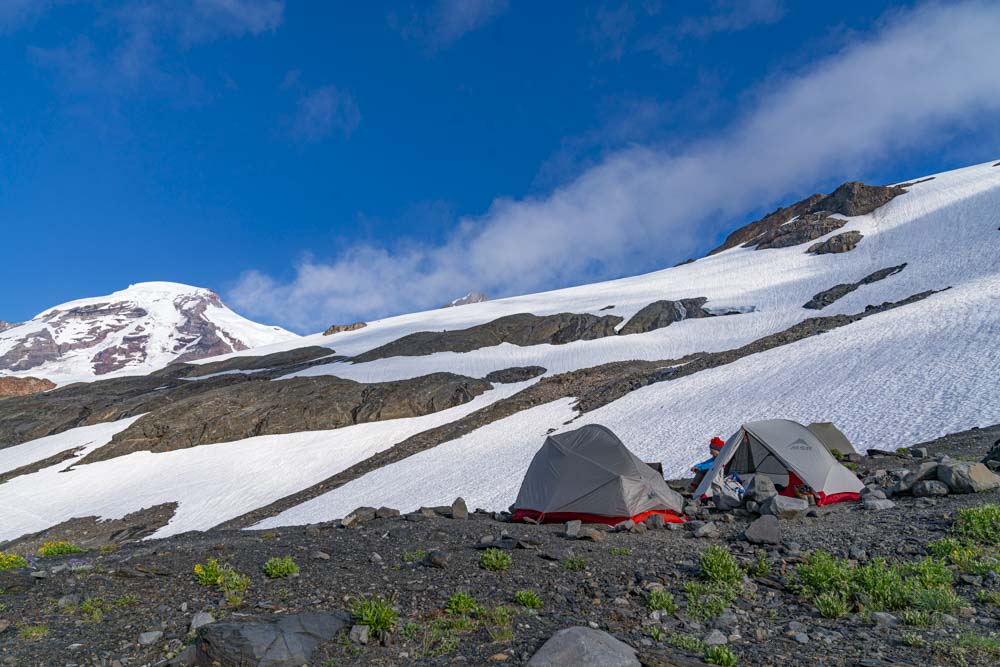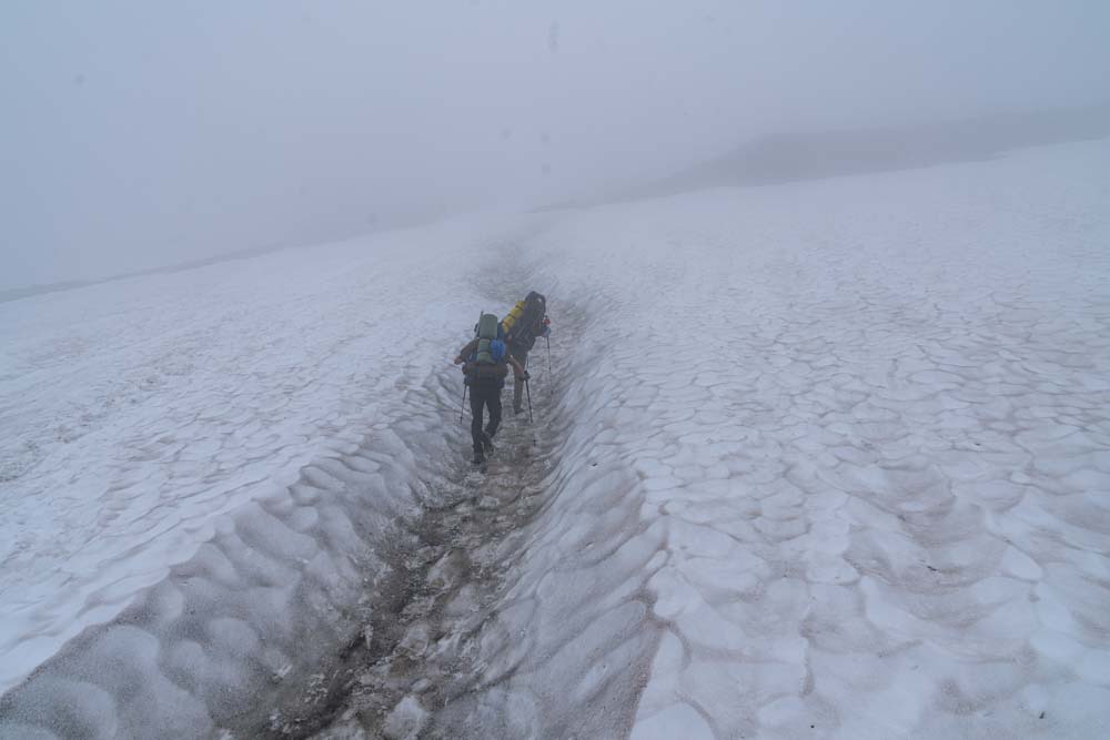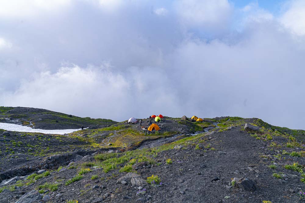 As we nearly pop out of the clouds we hit base camp. Like most big climbs in these parts and despite it being a weekday, there will be others. As usual, Brian chats up these campers and learns they are part of an alpine school. They are here for six days learning the “ropes”. They were surprised to learn that we will climb the mountain in the morning and then decent the full 7000 feet back to the car. By 6 pm tomorrow we will be having Thai food at Sister Jill’s while they will be here for a couple more days eating mountain house.