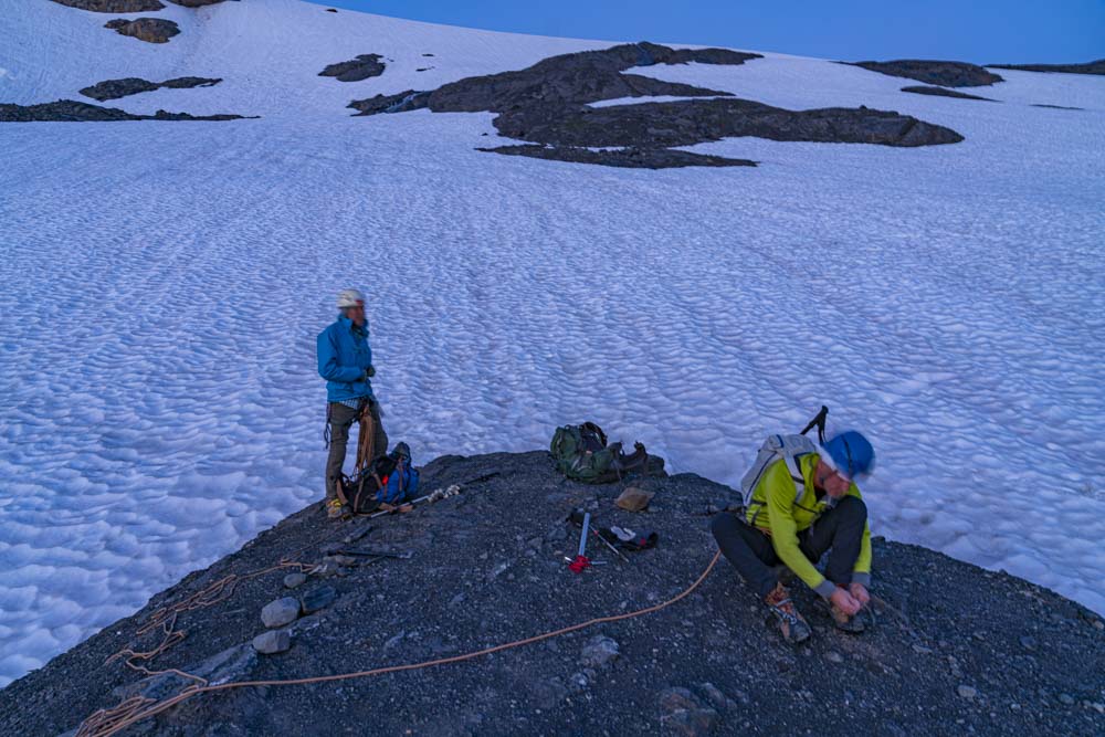 The rope is ready and the crampons go on.