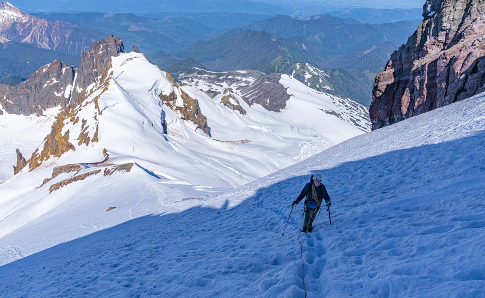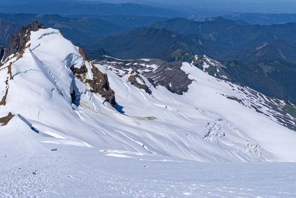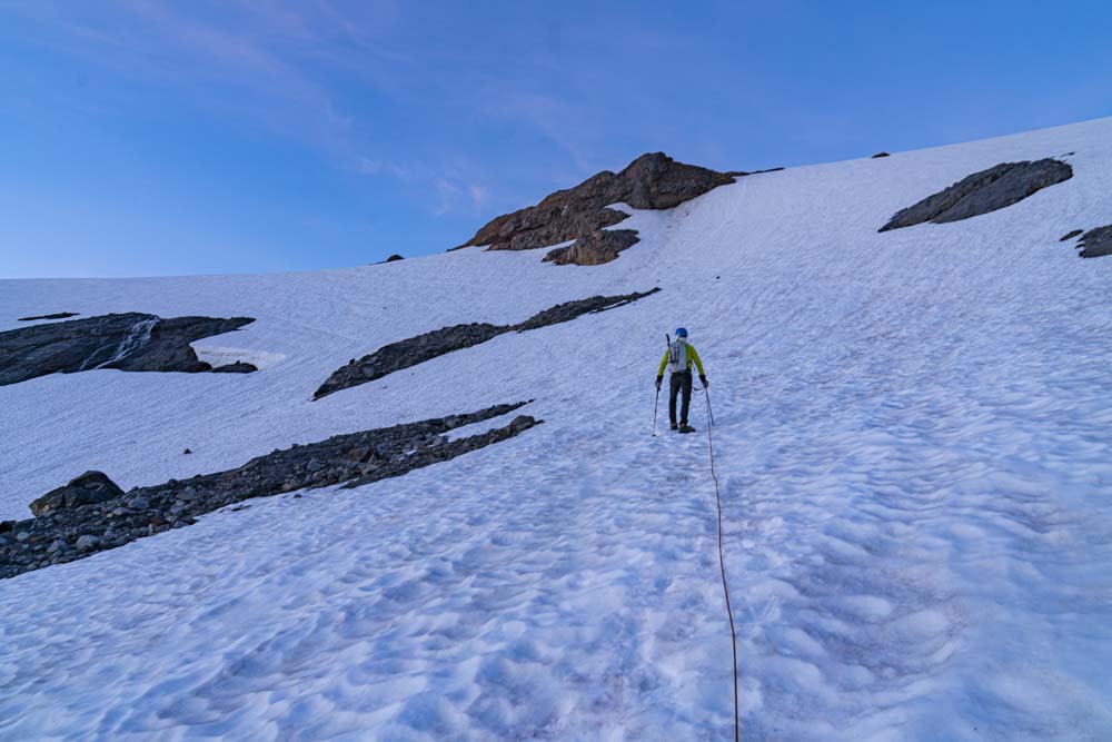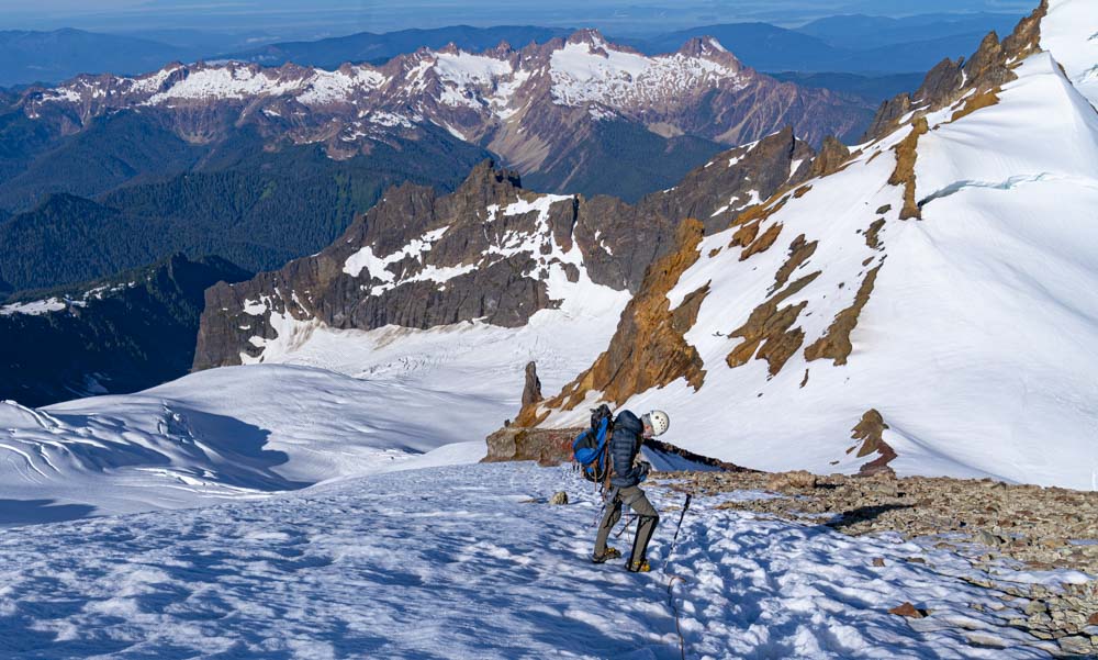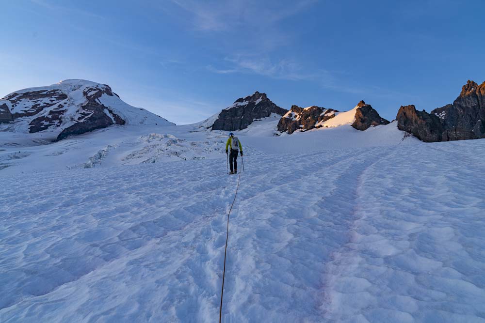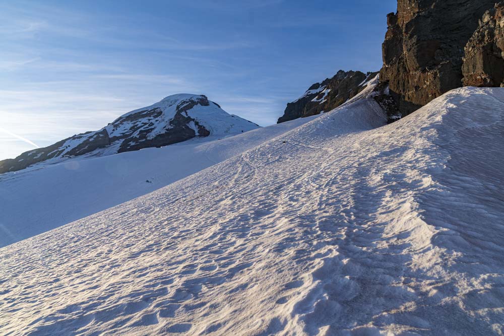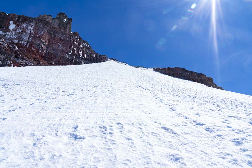One can just make out a faint trail on the glacier. We continue to work up below these rocks and to the ridge straight ahead. Then up the gap just on the right side of the summit.