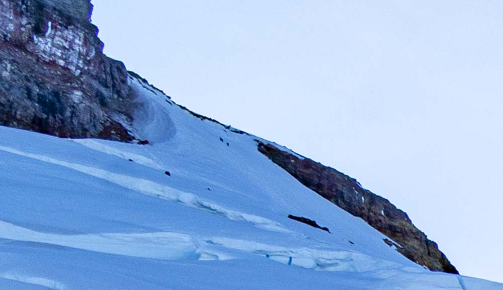 In this series of images I am attempting to show the scale of this mountain. They are all the same image, each one is a gradual blow up. In the first image of Tom, can you see the climbers in the upper left corner of the image? How about the first blowup to the left, the next blow up? Finally, the last blow up? There are two dots near mid image just under the rock ridge on the glacier.