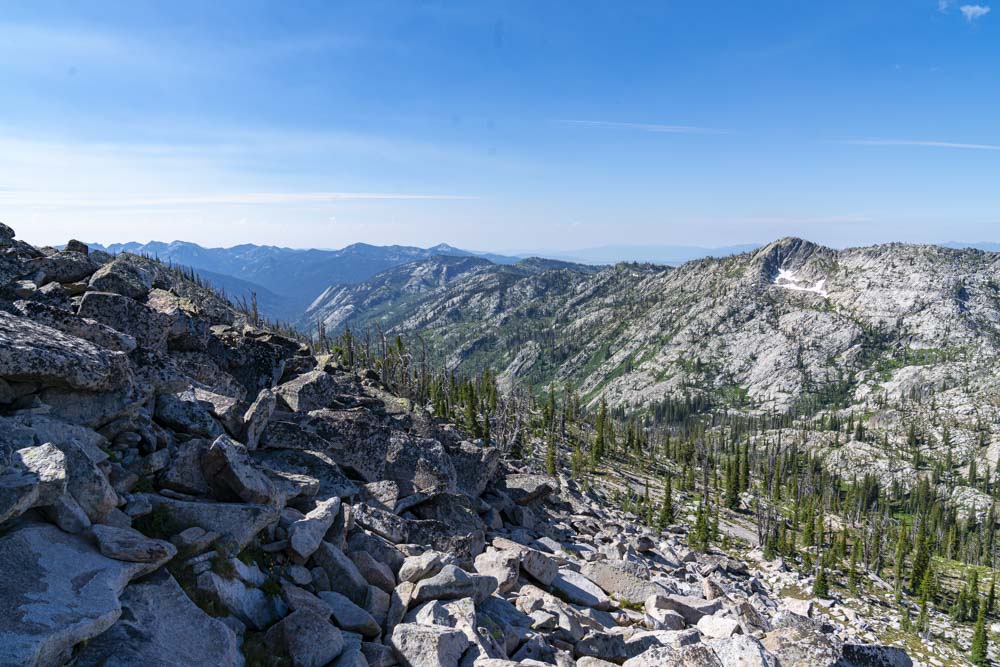 The top of Pot Peak is a giant pile of blocks. Down below you can just make out Box Lake.