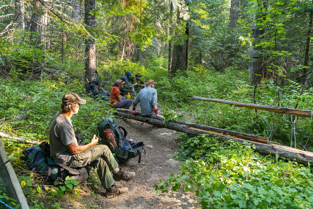 The crew takes a break on these conveniently located sitting logs. We had all the necessary tools to clear these logs but nobody was eager to jump up and start cutting.
