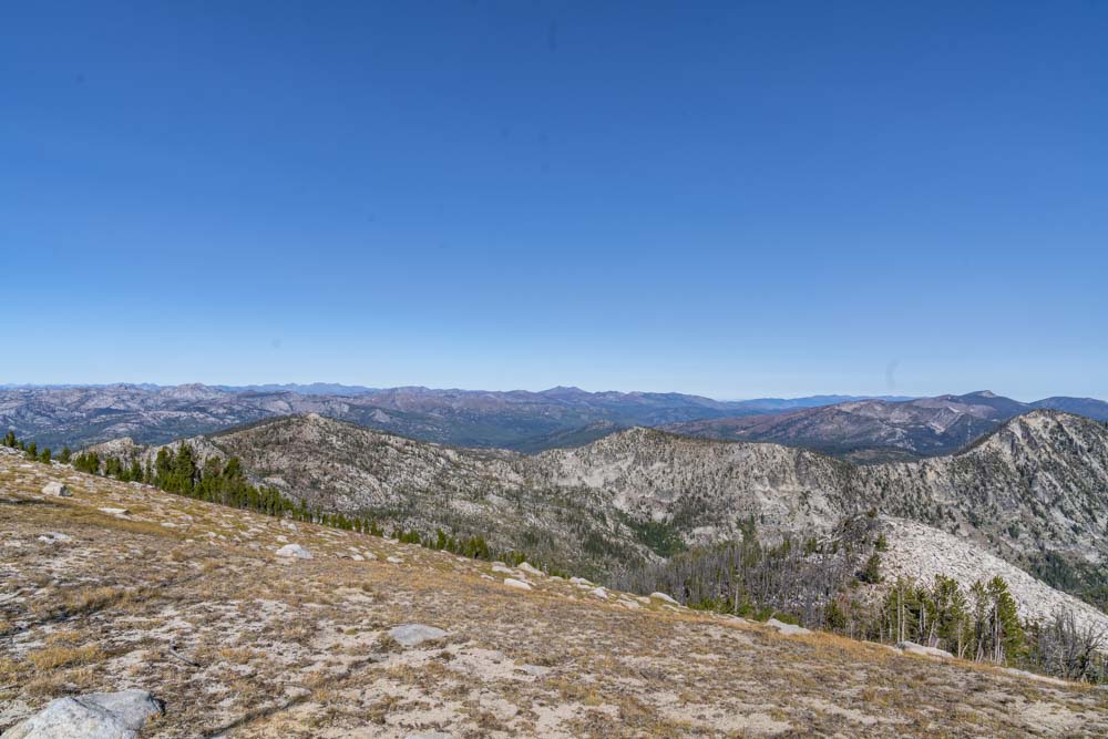Looking eastish from the summit of Storm Peak. Notice the dark peak, that is Victor Peak. In the distance are the ridges of the Frank Church Wilderness. Next up, we are headed across the flatfish basin to the saddle mid image left.