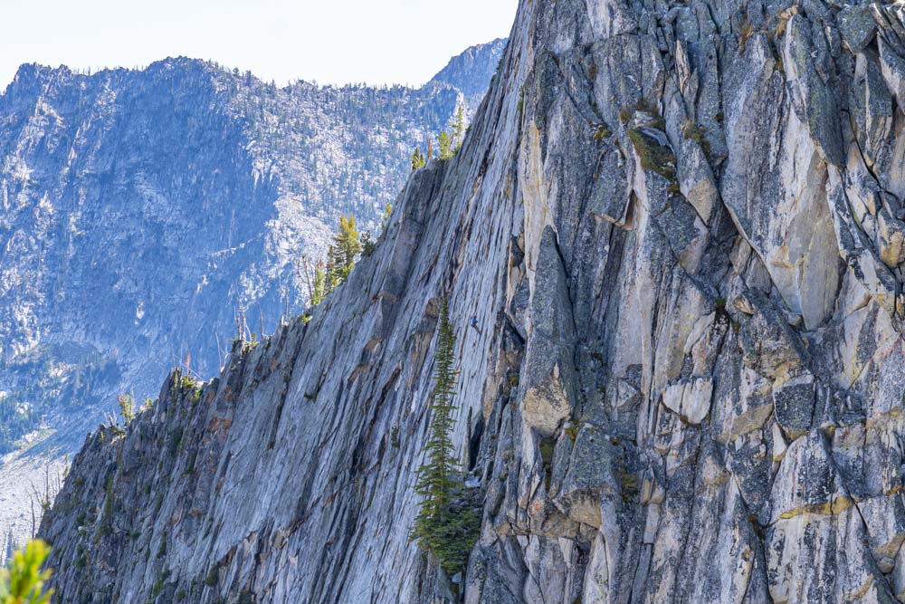 We take a moment to watch a rock climber on the face of Storm Dome. Apparently the climbing community has discovered this wall. There was a small group of climbers camped at the bottom and they were working this wall like Tom and I were working the lake. Can you see the climber on the wall?