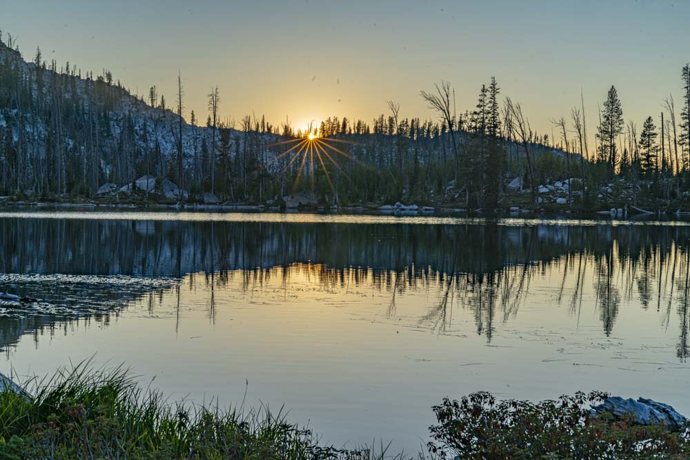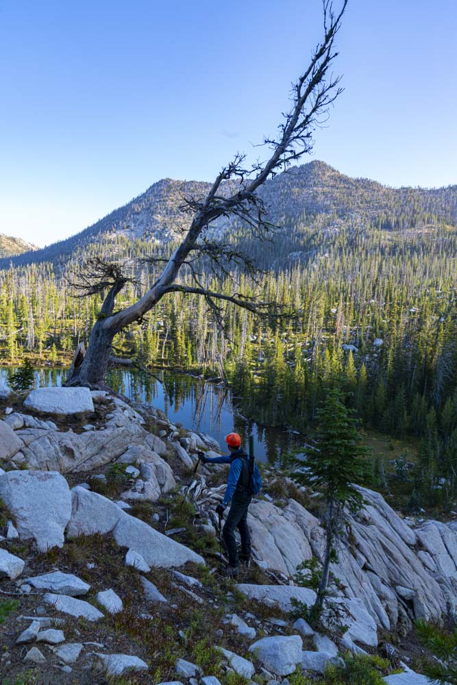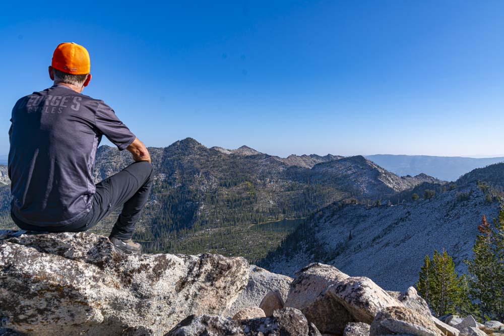Tom enjoys a beautiful morning overlooking Twenty Mile Lakes and just off Tom’s right side, yesterday’s Storm Peak. I turned on my phone here and texted many of my friends. Yesterday, Tom called his Dad from Storm Peak. While most areas in the Idaho Mountains don’t have cell service, the top of most peaks do have service.