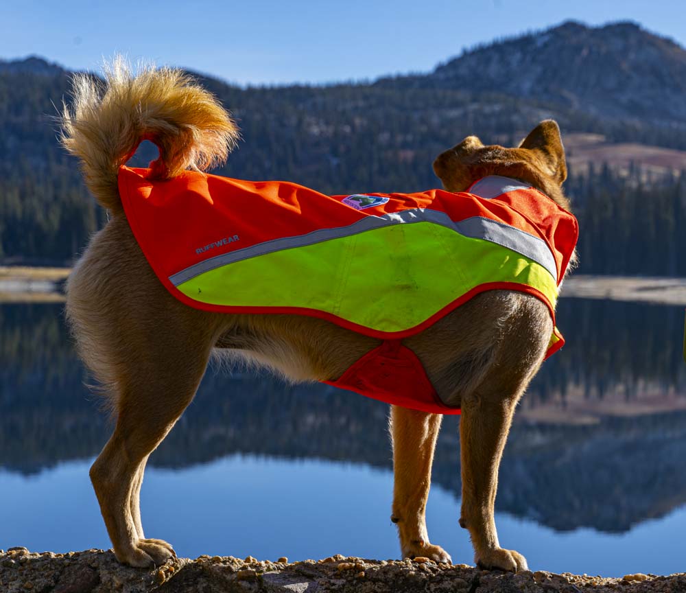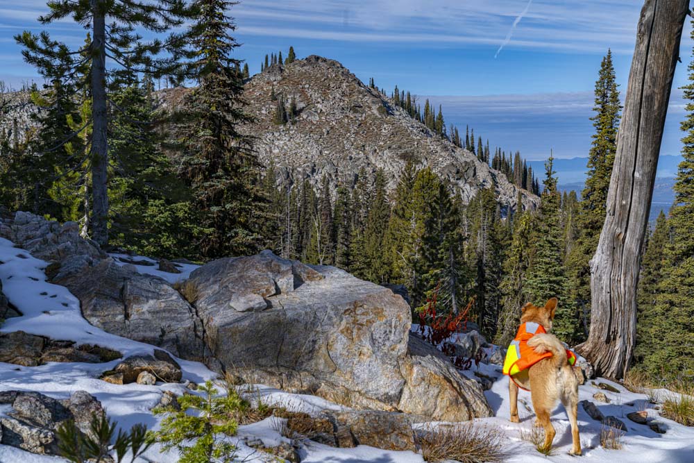 Coco surveys the ridge for squirrels. North Twin Peak on the Horizon.