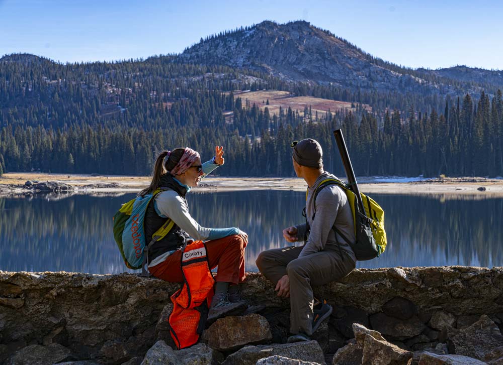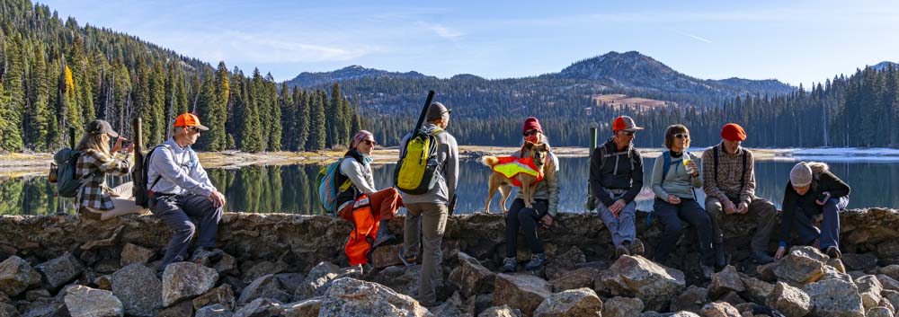 Now Jenny surveys the ridge for Squirrels. Jenny likes to stand out and the orange pants weren’t enough so she borrowed Art’s hunter orange vest. Barb, not so much.