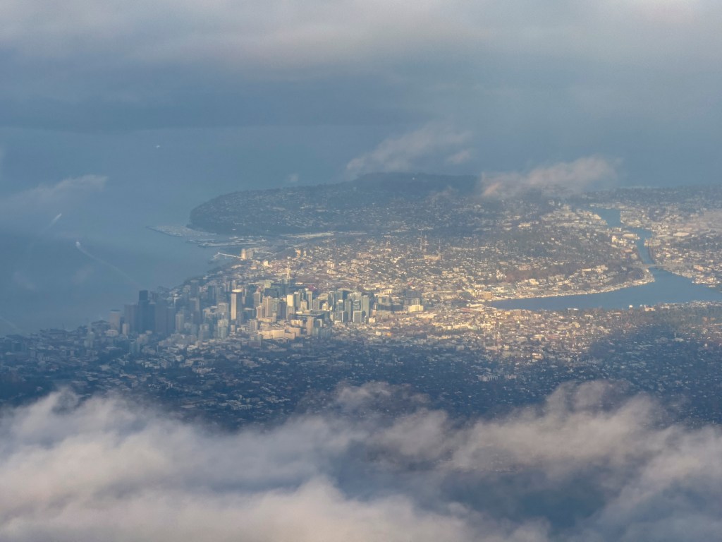 Like any voyage out of Lewiston, the first leg of this journey goes the exact opposite direction you are headed, to Seattle. As we approached Seattle, the clouds broke just in time for a few photos.