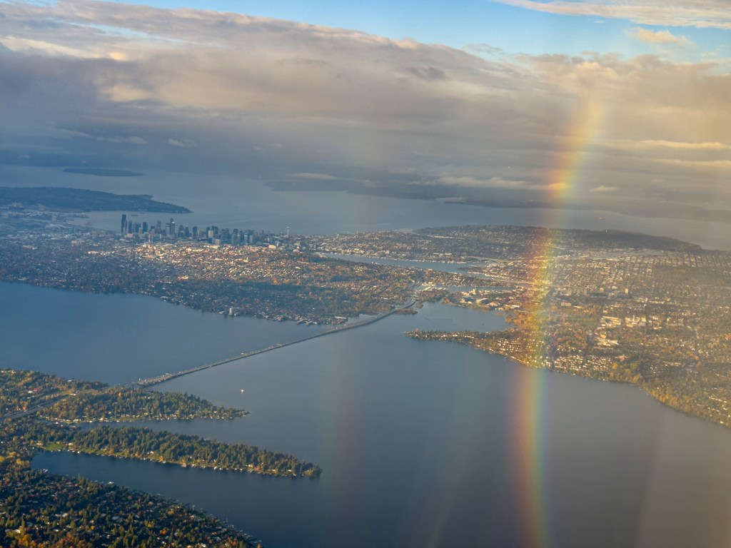 At the Seattle Airport, we prepare to get on our Air France flight to Paris. Oh, and the clouds did not remain parted for long.