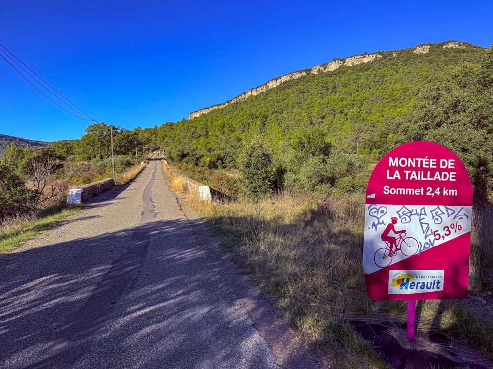 The official marker for the start of the climb, these signs are common here with the distance to the summit and the average grade. If you look carefully, you can see the e-bikes way up the road now.