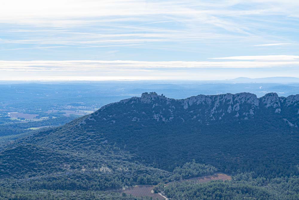 One can just make out the ruins of Château de Montferrand on the ridge in the fore ground, in the distance is the Mediterranean Sea.